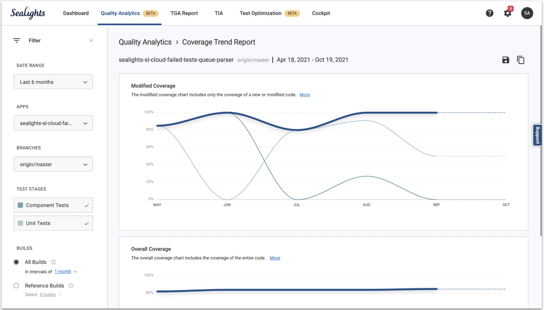 Modified Coverage Chart: Tracks coverage of changed code. Code changes you haven’t tested are your quality risks. The higher the coverage, the lower the chances for escaping defects. Aim for consistently high coverage for minimized risks and a strong quality culture.