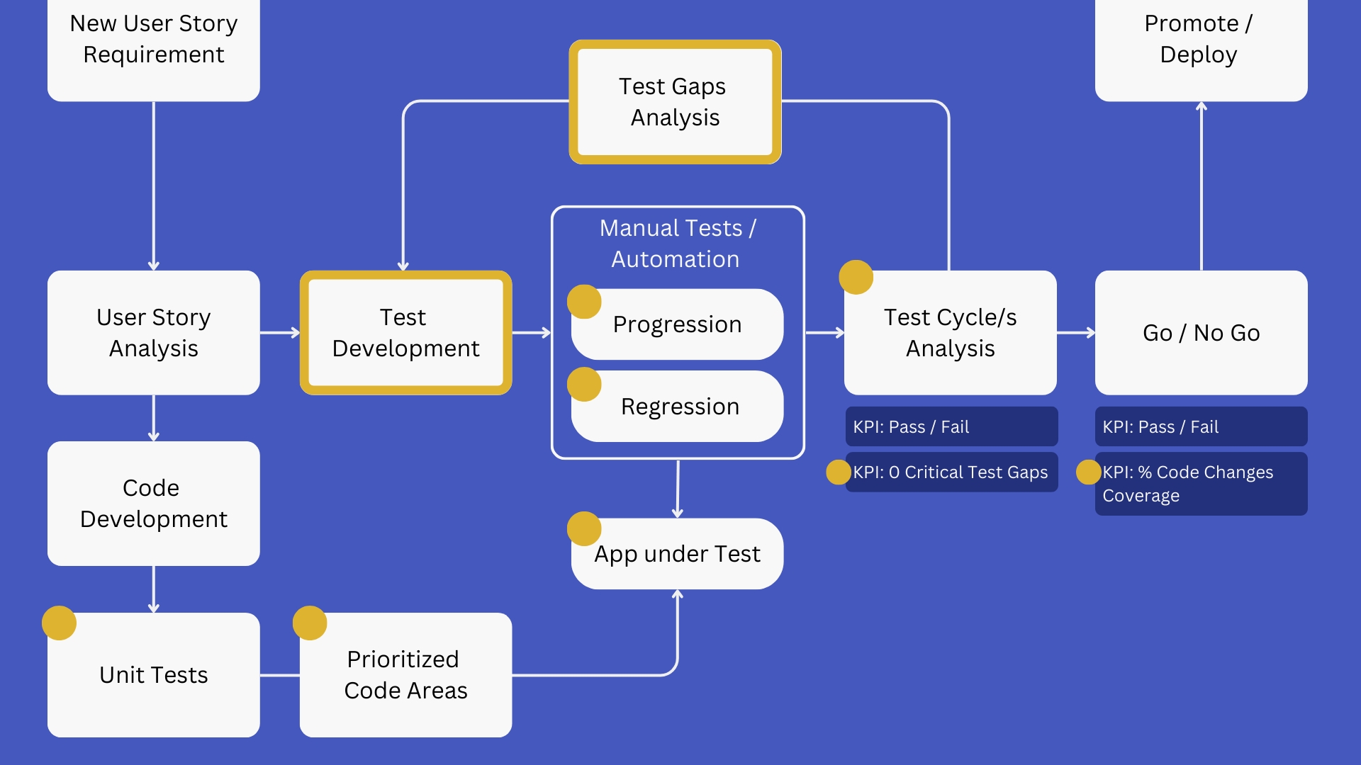The ultimate goal is to deploy the product without any critical test gaps and achieve the 0 critical Test Gaps KPI. This ensures readiness for the go/no-go decision and aligns with the Code Changes Coverage KPI.