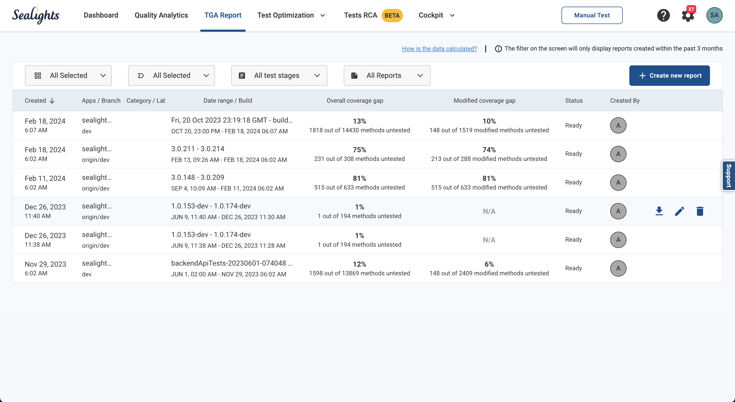 Unlock valuable insights into your code health with the SeaLights Test Gaps Analysis Report. Whether you're focusing on **immediate release stability** (**Release Quality Improvement**) or **long-term code health** (**Over Time Quality Improvement**), SeaLights will tailor your analysis for success, providing  comprehensive code coverage breakdowns within your chosen timeframe.&#x20;