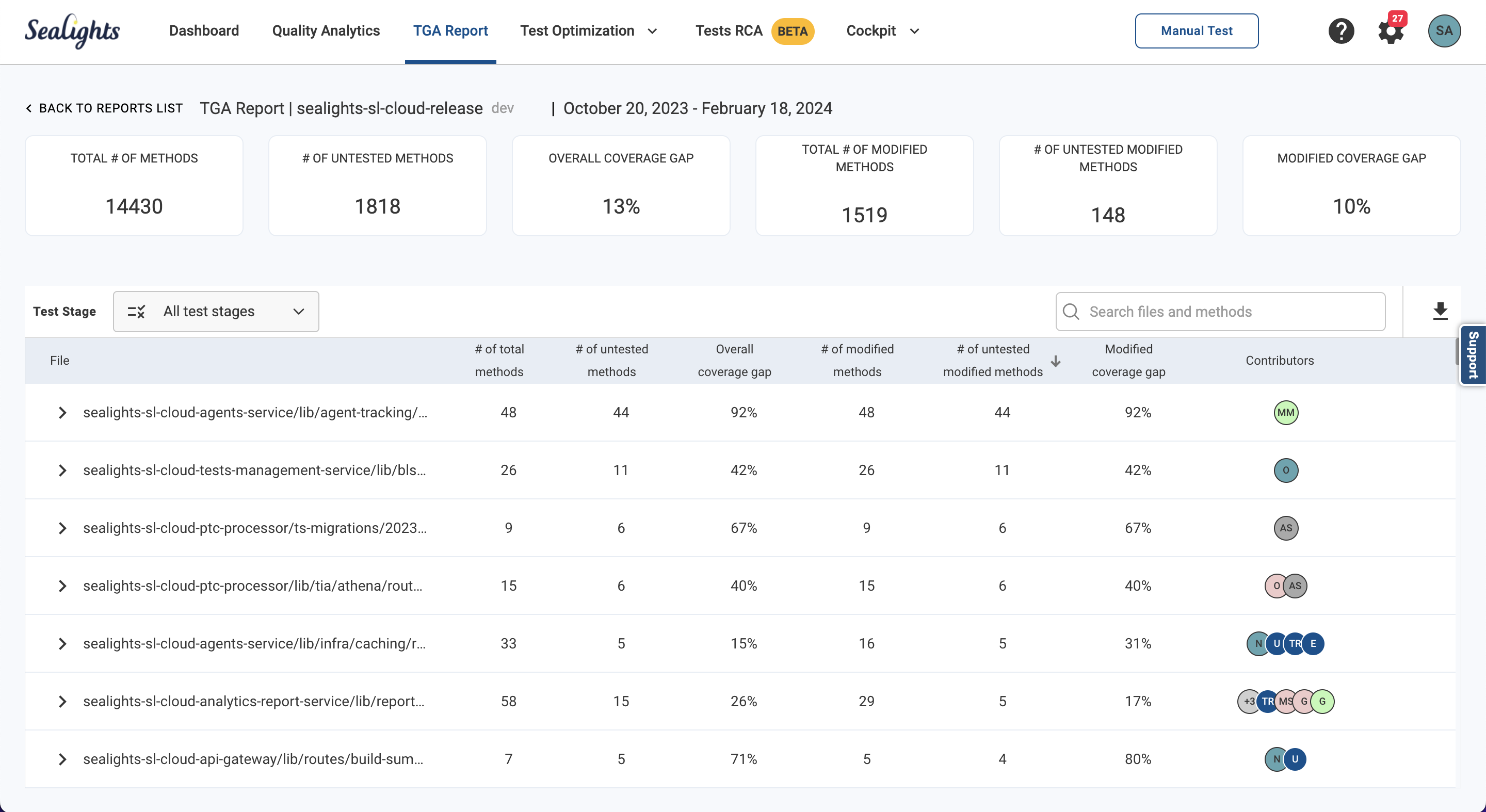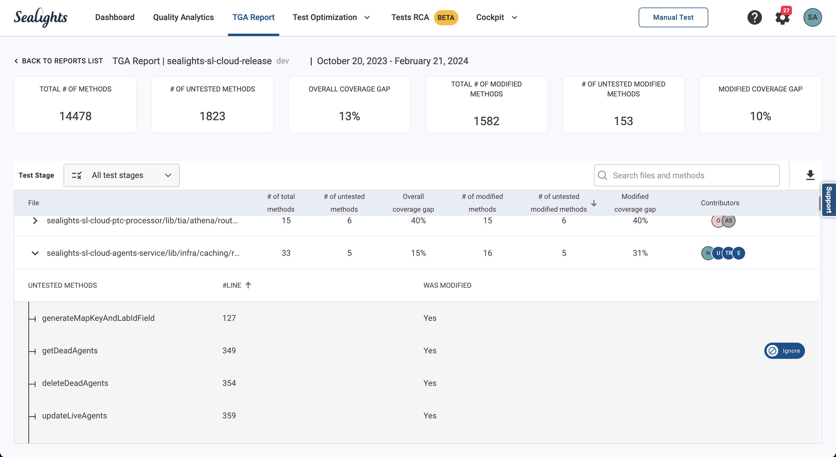 * **Modified Code Coverage Gap:** Focus on newly changed code by seeing the percentage of untested methods specifically within recently modified areas. This helps prioritize testing for immediate release stability.