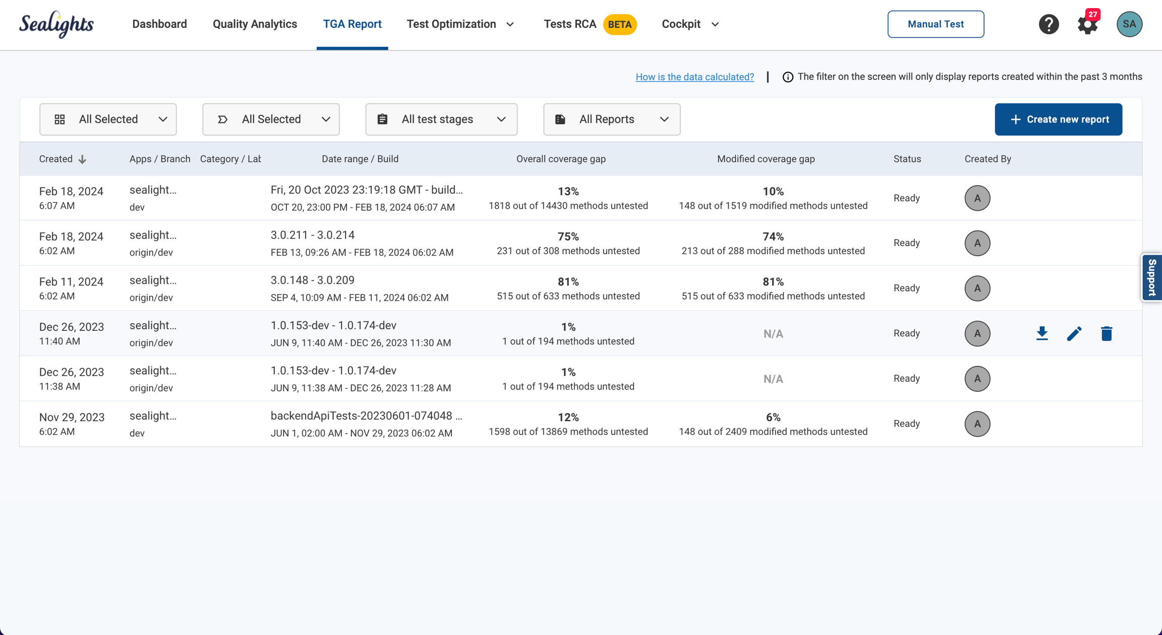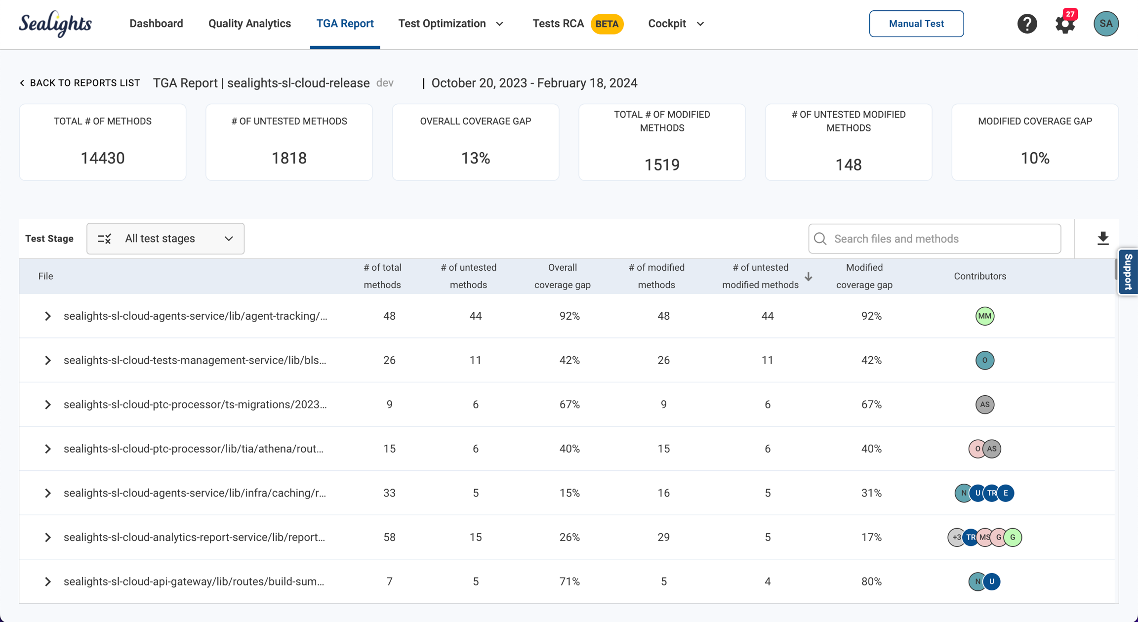 SeaLights offers dynamic analysis that covers various test types, including Regression, Functional, API, Integration, Exploratory and manual tests. It analyzes all builds, all test stages, and all code changes within your chosen timeframe.