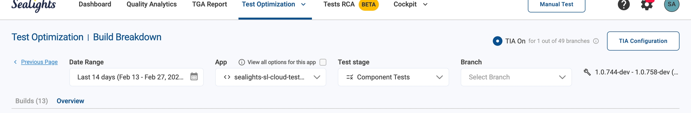 Customize for specific needs: Tailor the policy for individual apps, branches, and test stages through the Settings page or the Test Optimization - Build Breakdown page (using the TIA configuration button).