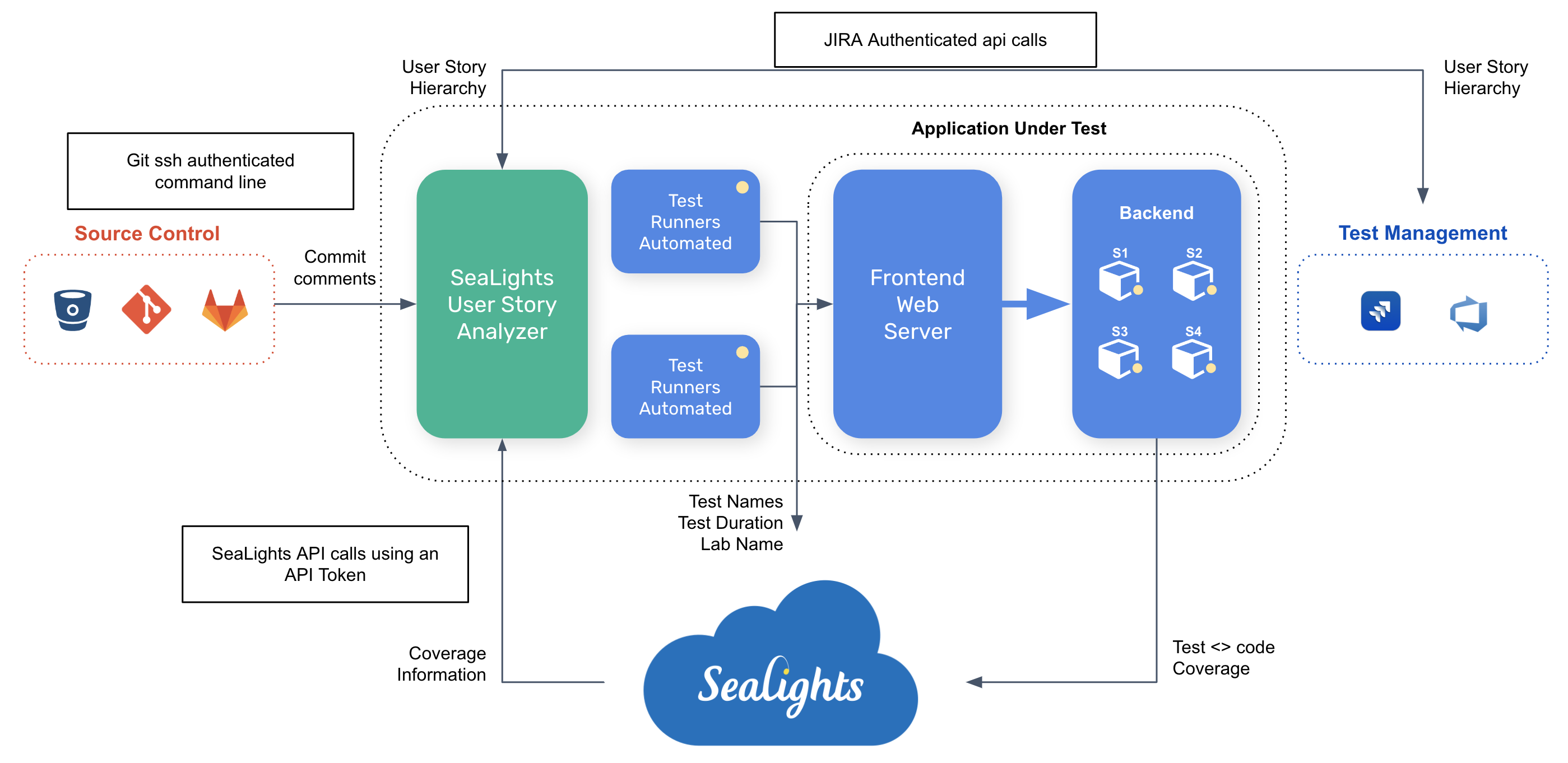 <figure><img src="https://content.gitbook.com/content/Ysudbcd27UHLa2tTHHbh/blobs/OC9LtBWgrJUNc9Gq6guK/image.png" alt=""><figcaption><p>SeaLights' User Story Code Coverage Architecture</p></figcaption></figure>