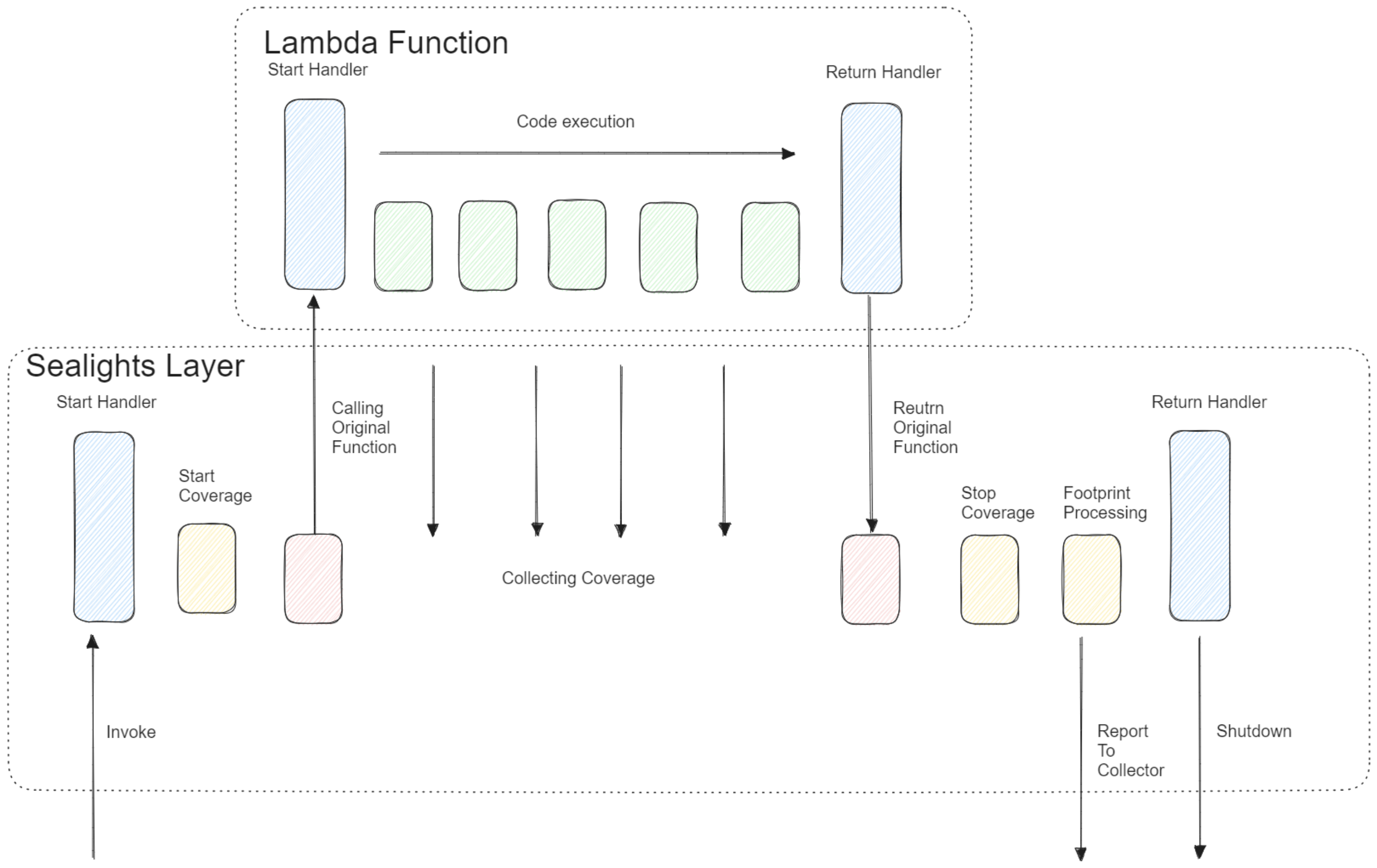The support of AWS lambda functions is handled by a lambda internal layer (sealights_layer) that is installed during the pipeline steps (more on that step is below) and intercepting the original lambda handler. Here is the flow when the lambda function is invoked: