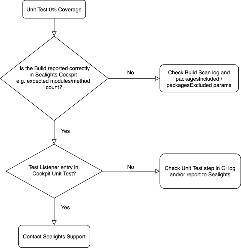 Under Cockpit > Build Monitor, check if the overall Build information is correct e.g. the expected number of modules and methods reported. If not, check the Sealights packagesIncluded and packagesExcluded arguments.